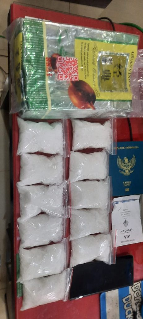 Setelah dilakukan penggeledahan, narkotika jenis sabu dengan merek “Guan Yin Wang” ditemukan di dalam sebuah tas berwarna oranye, bersama dengan sejumlah barang bukti lainnya, termasuk paspor, KTP, boarding pass, dan telepon genggam.